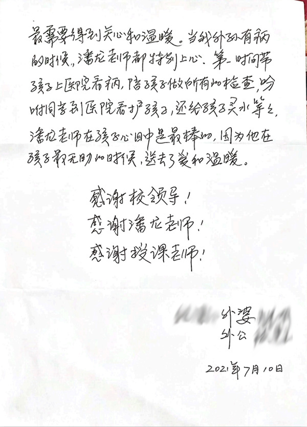 近日,沈陽新東方技工學(xué)校收到了一封來自學(xué)生家長情真意切的感謝信。信中介紹了他們的外孫小元(化名)在西餐專業(yè)班主任老師潘龍的幫助下,學(xué)習(xí)和生活上都有了明顯的變化,字里行間流露出作為家長對學(xué)校、老師的感謝之情。信中每一個字、每一句,都是家長發(fā)自肺腑的感激之情和承信任,對我們學(xué)校和老師,既是一份鼓勵、一種肯定,更是一種鞭策、一種激勵。