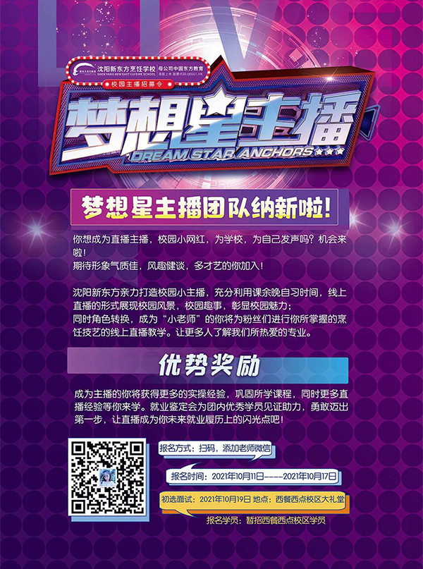 新媒體時(shí)代的到來,直播,是未來企業(yè)、單位、個(gè)人品牌宣傳及發(fā)展的盈利模式。沈陽(yáng)新東方親力打造校園小主播,充分利用課余晚自習(xí)時(shí)間,線上直播的形式展現(xiàn)校園風(fēng)景,校園趣事,彰顯校園魅力;同時(shí)角色轉(zhuǎn)換,成為”小老師“的你將為粉絲們進(jìn)行你所掌握的烹飪技藝的線上直播教學(xué)。讓更多人了解我們的熱愛的專業(yè)。