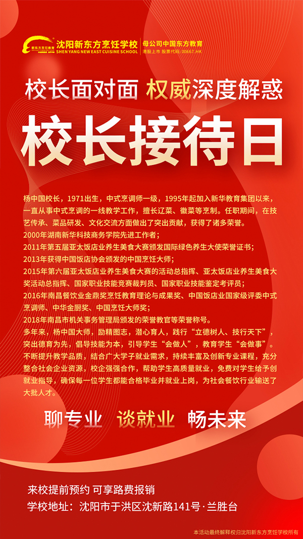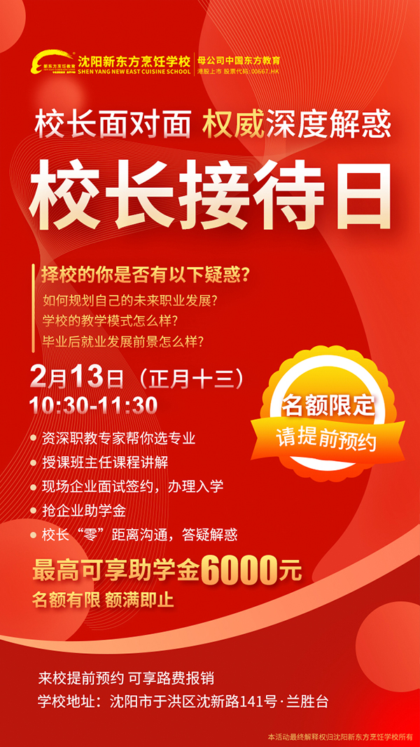 此次校長接待日,旨在為學校與學子搭建直接溝通的平臺,幫助學子和家長更加深入、全面的了解學校,并為他們解疑答惑,從而幫助學生更好的做出自己的職業(yè)生涯規(guī)劃。只要你提出了問題,沈陽新東方技工學校的楊校長都會一一為你解答。與校長面對面接觸、面對面交流的機會已擺在你的眼前!我們周末等你來喔!