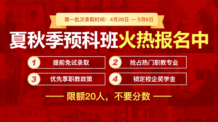 夏秋季預科班是指為提前擇校學技術(shù)的初高中生展開的夏秋季定向特招班。學生可提前體驗專業(yè),進入預科班學習,提前打好專業(yè)課基礎,更加深入的了解專業(yè),為2022年秋季正式入學打下基礎。