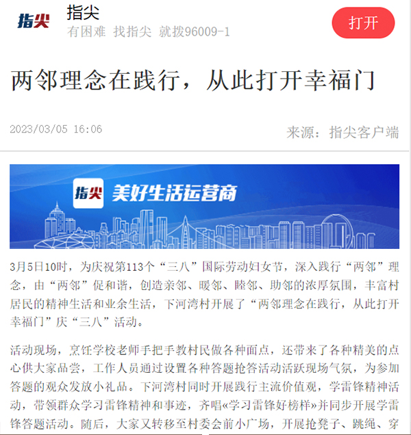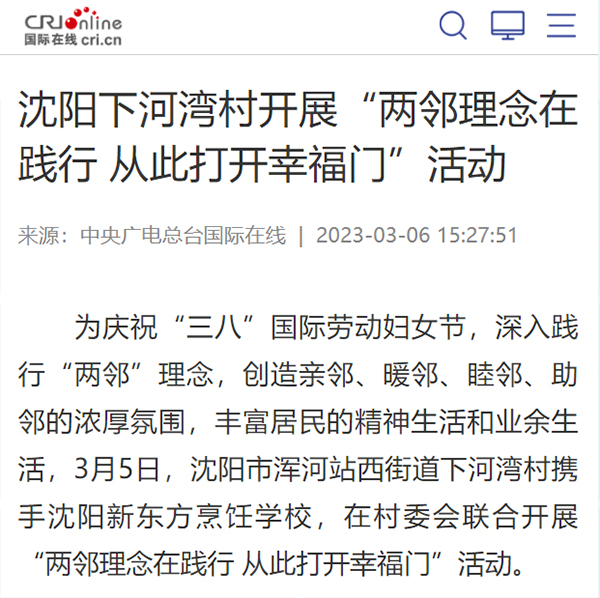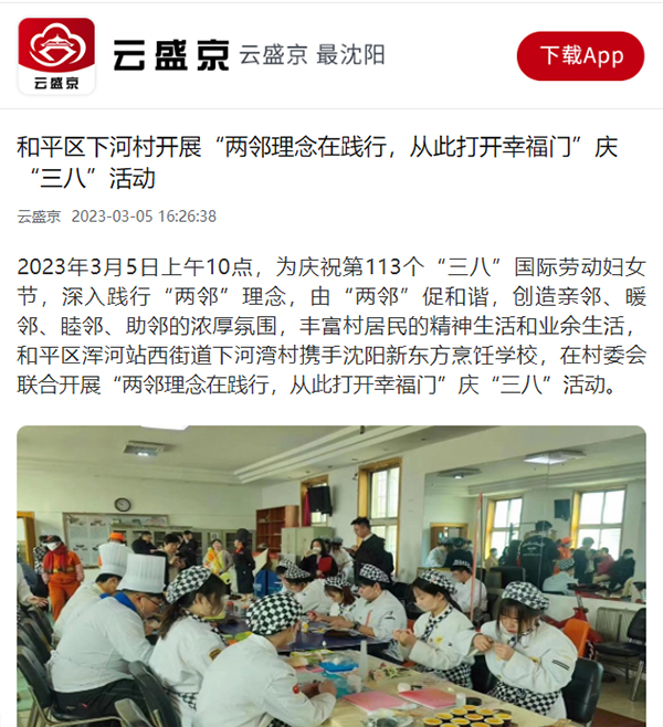 2023年3月5日上午10點(diǎn),為慶祝第113個(gè)“三八”國(guó)際勞動(dòng)?jì)D女節(jié),深入踐行“兩鄰”理念,由“兩鄰”促和諧,創(chuàng)造親鄰、暖鄰、睦鄰、助鄰的濃厚氛圍,豐富村居民的精神生活和業(yè)余生活,沈陽新東方技工學(xué)校攜手和平區(qū)渾河站西街道下河灣攜手,在村委會(huì)聯(lián)合開展“兩鄰理念在踐行,從此打開幸福門”慶“三八”活動(dòng)。