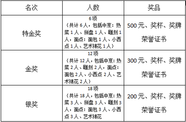 參賽選手:以班級(jí)為單位參賽的代表隊(duì),由班級(jí)挑選5名優(yōu)秀選手共同制作出一桌完整的宴席。