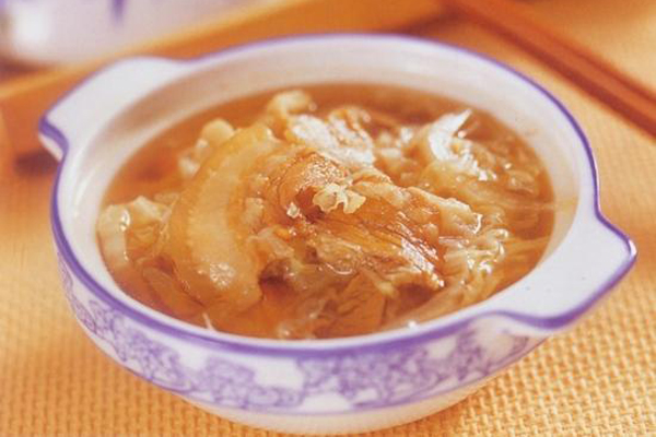 酸菜是東北地區(qū)的一種家常特色食物,采用當(dāng)?shù)厥a(chǎn)的大白菜腌制而成,極具東北地方特色。酸菜燉白肉,口味酸香咸鮮,入口即化,是沈陽人桌上一道家常菜品。