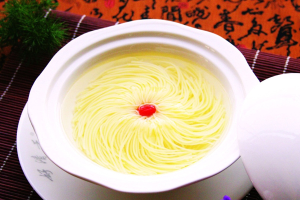 長沙新東方的向寒大師為我們帶來蒙眼切菊花豆腐、牙齒切黃瓜、整鴨去骨等絕活。菊花豆腐是運用精湛的刀工將豆腐切成粗細(xì)均勻的絲,置于湯汁中,因其形似綻放的菊花而得名。切好的豆腐絲放入水中,在水的浮力作用下,原本一團(tuán)團(tuán)的豆腐絲瞬間綻放,成為一朵朵美麗的菊花。大師表演的切菊花豆腐絕活,讓你置身美食世界的同時還能享受一場場精彩絕倫的視覺盛宴。