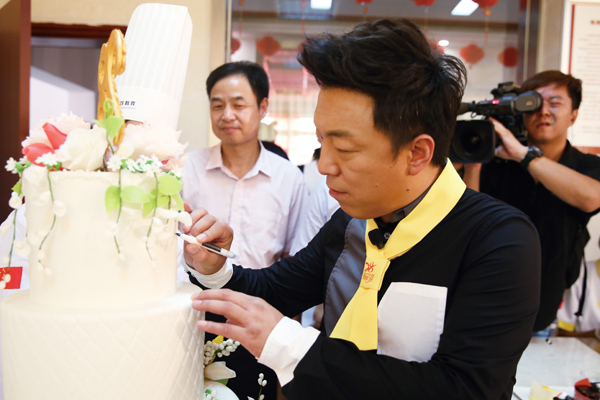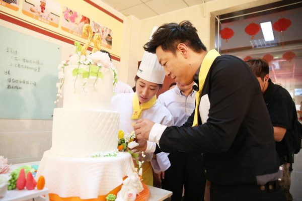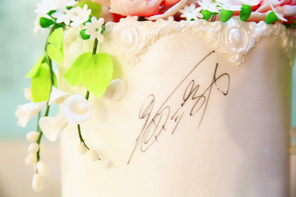 一走進(jìn)西點(diǎn)課堂,西點(diǎn)甜品濃郁的奶油芳香撲面襲來,琳瑯滿目各具特色的西式甜品讓人仿佛置身在了甜品屋。正在制作翻糖蛋糕的新東方烹飪教育留法大師王寅如吸引了黃渤的目光。只見王老師先用糖撲將糖粉面均勻的撲在案板上,用牙簽將粉色素粘在糖膏上,將其揉搓均勻后搟成一大圓片,然后借用五瓣花模具,一朵嬌艷欲滴盛開的玫瑰花呈現(xiàn)在眼前。神奇的美食體驗(yàn)邂逅男神的好奇心,看到翻糖蛋糕的制作過程,生活中較少接觸到西點(diǎn)制作的黃渤直呼:“今天來的太值了!”隨后,黃渤在這款唯美精致的蛋糕上簽下名字,作為紀(jì)念。