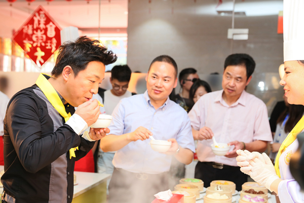 在中式面點(diǎn)課堂,四川名小吃鐘水餃第28代傳承人,新東方烹飪教育陳海燕大師正在制作鐘水餃。晶瑩剔透,小巧玲瓏的鐘水餃像接受過訓(xùn)練似的,一個(gè)接著一個(gè)跳到電煮鍋里,如小魚般隨著水流一起舞蹈。待餃子煮熟后,黃渤老師蘸著微辣、鮮香、咸中帶甜的紅油味碟,一口咬下去,回味無窮。只是品嘗當(dāng)然不夠,課堂上,黃渤虛心向陳大師請教包鐘水餃的方法,并跟隨陳大師一起包起了鐘水餃。只見黃渤先取一塊餃子皮,放入餡料,然后在餃子皮的邊緣抹上清水,把餃子皮對折后,先把中間捏緊,再把兩邊捏緊,一個(gè)像模像樣的“黃渤牌”鐘水餃呈現(xiàn)在大家面前。