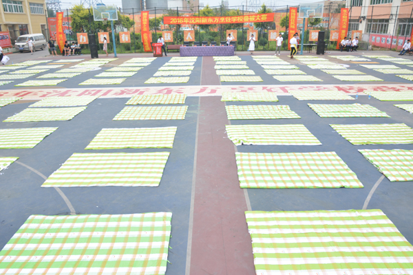 比賽以小組晉級的形式進行,淘汰晉級半決賽,最后進入決賽。2分鐘的比賽時間,中烹、西點、西餐、3個方向百名參賽隊員。“參賽床被”整齊的鋪放在長達30米的“沈陽新東方技工學(xué)校百人疊被大賽”地貼兩側(cè)。除了參賽選手,操場周圍也緊滿了看比賽的同學(xué)們。此時參賽選手已做好準備,靜待比賽開始。