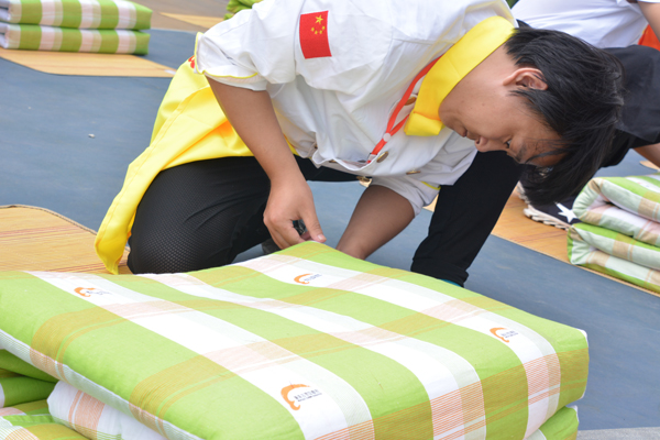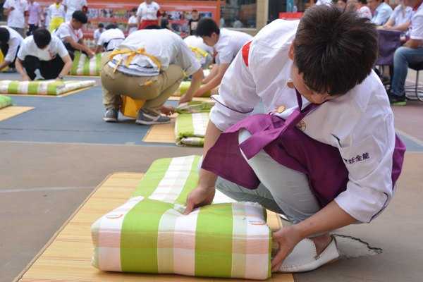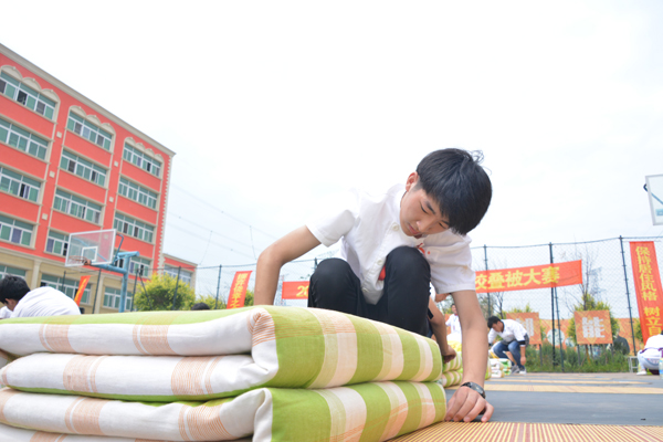 不要小看疊被,其實疊被和烹飪一樣是對耐心,細心,手法的綜合比較。時間2分鐘,軍被標準,時間短要求高。隨著哨聲,比賽正式開始了,操場上放著輕快的音樂,但選手的狀態(tài)卻是高度集中,在最后幾秒鐘依舊對整體進行整理。