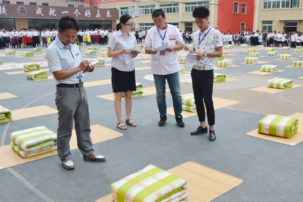 比賽結(jié)束后,本著公開、公正、公平的原則評委老師進行打分。“豆腐塊”般的軍被整齊排列。這正是平時學(xué)校對內(nèi)務(wù)高要求,高標準的結(jié)果,也是同學(xué)良好生活習(xí)慣的體現(xiàn)。如此整齊的軍被,得低分都難!