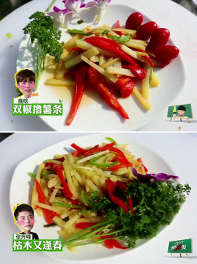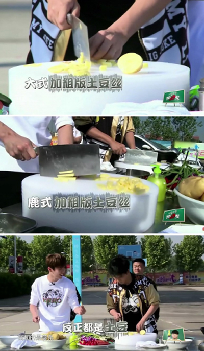 為了決定轉(zhuǎn)校生們適合學(xué)習(xí)哪個(gè)技能專業(yè),老師要求通過三項(xiàng)測(cè)試決定分班,在烹飪測(cè)試中,鹿晗首秀廚藝,面對(duì)規(guī)定題目土豆絲,鹿不羈化身鹿大廚上線,更提出自己偏愛“酸”口味,要自加難度,決定做“醋溜土豆絲”。然而在隨后的操作中,鹿晗稍顯拙劣的刀工顯露無(wú)遺,學(xué)大老師把土豆絲任性的切成了土豆塊�?吹狡渌瑢W(xué)迅速完成切絲進(jìn)入下一步,鹿晗開玩笑說:“他們太草率了”,更是和大張偉完成一首全新單曲《太草率很有愛》,并已于14日晚在愛奇藝正式上線。
