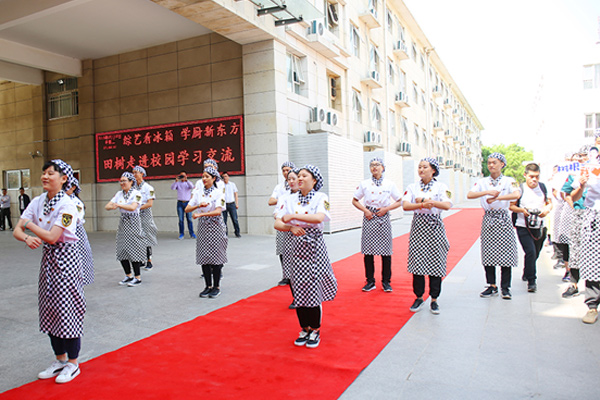 因?yàn)閷W�,所以專業(yè);因?yàn)閷I(yè),所以榮耀。在“知行合一,明德尚能”的校訓(xùn)墻前,百名新東方烹飪學(xué)子穿著整潔校服,齊立三尺桌臺(tái)前一展擊鼓翻鍋的磅礴氣勢。“一為三,二為五”,“八兩油勺,三尺灶臺(tái)”,擊鼓翻鍋欲聾震撼,恢宏之氣直叫田樹同學(xué)在折服于各“學(xué)長學(xué)姐”的專業(yè)技能之余躍躍欲試,現(xiàn)場更是拿起鼓槌和著學(xué)生的口號(hào)體驗(yàn)了一番震撼的擊鼓翻鍋。