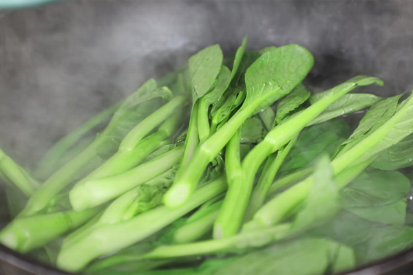 2、鍋內(nèi)寬水,放入食用油,鹽,將菜心放入,煮熟