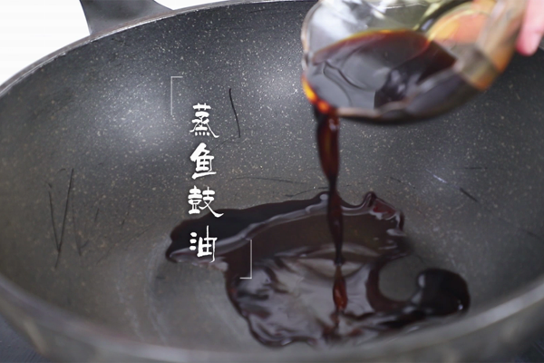 4、鍋內(nèi)倒入蒸魚豉油,糖進(jìn)行熬制。完成后淋到菜心上