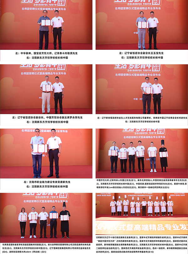 名師團(tuán)受聘儀式暨高端精品專業(yè)發(fā)布會出席的嘉賓有:國家級非物質(zhì)文化遺產(chǎn)遼菜泰斗劉敬賢先生、沈陽新東方技工學(xué)校校長楊中國、遼寧省飯店協(xié)會副會長王玉寶先生、沈陽市職業(yè)能力建設(shè)專家吳建新先生、遼寧省飯店協(xié)會副會長,中國烹飪協(xié)會副主席羅永存先生、遼寧新前程高校畢業(yè)生人才交流服務(wù)有限公司董事長,菲律賓中國遼寧總商會會長祁跡先生;中國烹飪大師,遼菜傳承人劉國江先生、新東北菜創(chuàng)始人,中國名廚白金獎獲得者李東生先生、中國名廚,國家高級技師李克慶先生,黑天鵝中一級裱花師賀燕女士、愛意牛排館,安格斯厚切牛排,Leo聯(lián)合創(chuàng)始人劉欣先生、胡大全季餐飲管理有限公司沈陽店廚師長林先進(jìn)先生、沈陽國字菜籃子團(tuán)膳有限公司涼菜總監(jiān)肖旭先生、波斯尼亞西餐大師adem(阿達(dá)姆)、馬來西亞國際語言學(xué)校深造回國教師閆蓓蕾;沈陽新東方校長助理朱葛,沈陽新東方中烹校區(qū)負(fù)責(zé)人祁國林,沈陽新東方西點(diǎn)西餐學(xué)院校區(qū)負(fù)責(zé)人薩偉楠,沈陽新東方教務(wù)負(fù)責(zé)人張?jiān)�,沈陽新東方就業(yè)負(fù)責(zé)人孫世龍;沈陽新東方遼寧十佳行政總廚陳云龍老師;國家中式烹調(diào)技師胡振東老師;國家中式烹調(diào)技師申有鵬老師;國家中式烹調(diào)師“榮獲中國烹飪大師”之稱的顏世豹老師;國家中式烹調(diào)二級技師杜金光老師;國家西式面點(diǎn)高級技師,新華教育集團(tuán)副主授那春艷老師;國家西式烹調(diào)技師張旭老師;西點(diǎn)一級技師,新華教育集團(tuán)副主授尚遠(yuǎn)洋老師;國家高級西式面點(diǎn)師高級營養(yǎng)師李磊老師。本次活動也受到了東北新聞網(wǎng),沈陽晚報的媒體朋友們的支持報道。此次會議由遼寧廣播電視臺大海熱線節(jié)目著名主持人老三主持。