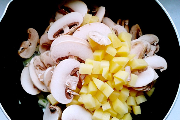 7、倒入約1/2小碗的清水,蓋上鍋蓋,小火煮至蘑菇軟爛,湯汁收干。