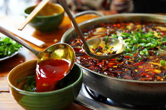 3.取2大湯勺油,里面再給點(diǎn)花椒和辣椒,燒辣,淋在火鍋上。
