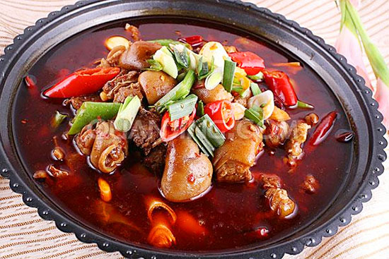 4. 再下蔥結(jié)、姜片、花椒,加紅干辣椒整只、桂皮、茴香、當(dāng)歸和清水1000克,加蓋燒沸后,移小火上煨2小時(shí)左右,至肉酥,撈出桂皮,茴香,蔥結(jié),姜片,紅干辣椒,然后將其倒入火鍋內(nèi),繼續(xù)煮10分鐘左右即成美味的川味狗肉火鍋。
